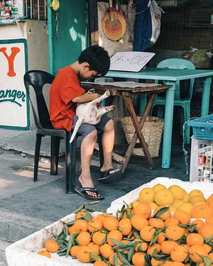 Boy and His Puppy - Philippines Original street photo taken in 2023 the Philippines with a Fujifilm X100V digital camera.